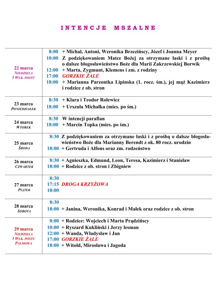 Intencje Mszalne, 22 – 29 marca 2026 r.